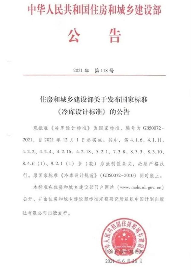 由住房和城鄉(xiāng)建設(shè)部關(guān)于發(fā)布國(guó)家標(biāo)準(zhǔn)《冷庫(kù)設(shè)計(jì)標(biāo)準(zhǔn)》、《冷庫(kù)施工及驗(yàn)收標(biāo)準(zhǔn)》的公告,國(guó)家標(biāo)準(zhǔn)《冷庫(kù)設(shè)計(jì)標(biāo)準(zhǔn)》編號(hào)GB50072-2021,國(guó)家標(biāo)準(zhǔn)《冷庫(kù)施工及驗(yàn)收標(biāo)準(zhǔn)》編號(hào)GB51440-2021,自2021年12月1日起實(shí)施。